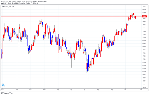 【メキシコペソ円今週の予想(7月22日)】*予想レンジ:7.70円~8.10円。*メキシコペソ円は、米国との関税協議が進展するとの期待から、押し目買い···