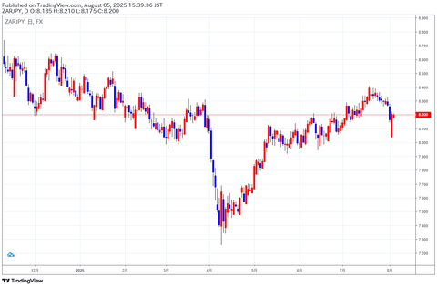 【南アフリカランド円今週の予想(8月5日)】*予想レンジ:8.1円~8.4円*今週のランド円は、追加利下げ見通しから上値の重い展開になろう。南アフリ···
